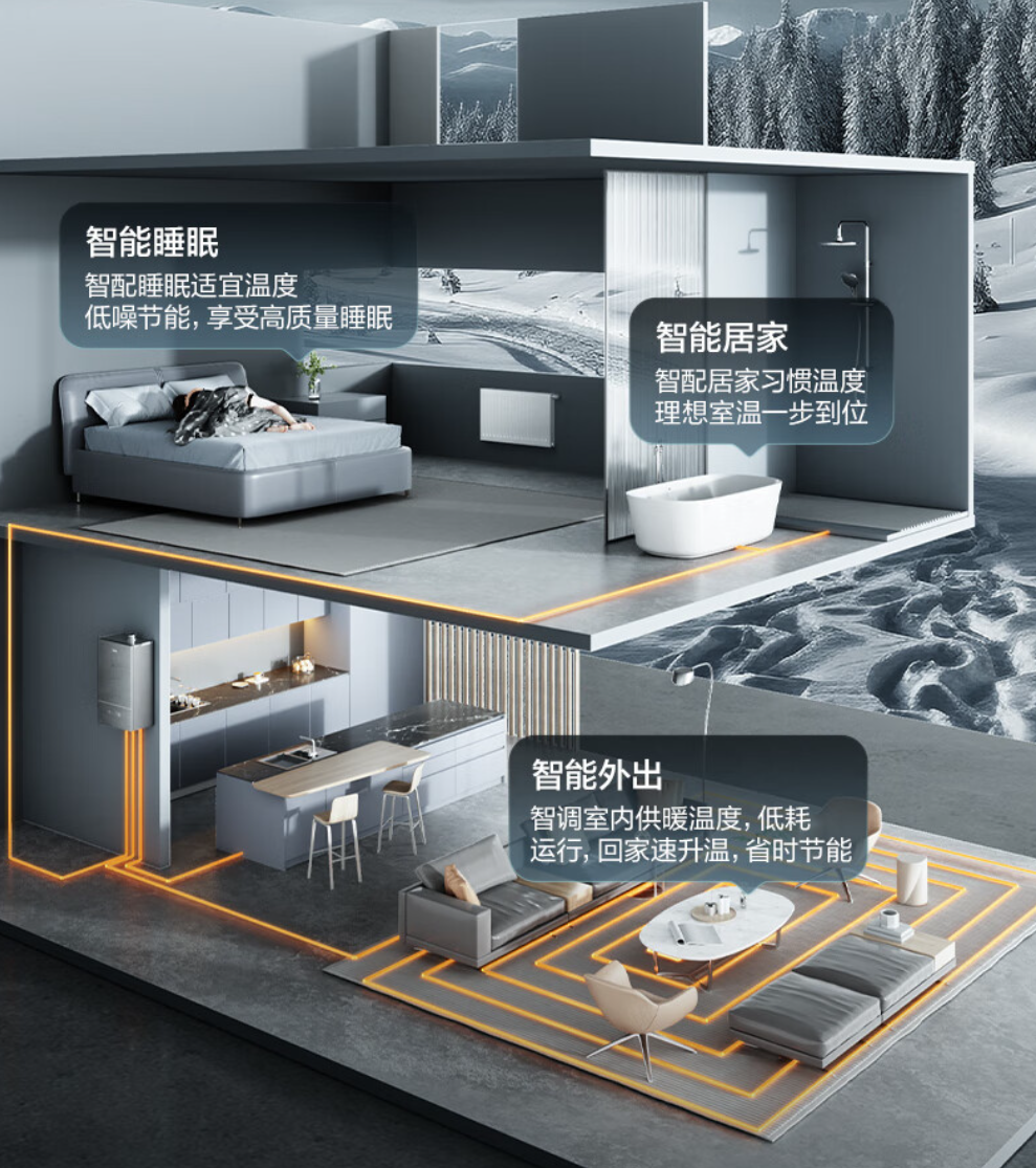 此外,美的hnm1壁挂炉在智能化设计上,充分考虑了现代家庭便捷生活的追求。该壁挂炉能够实现智能睡眠、智能居家、智能外出三大模式一键切换,满足用户在不同场景下的需求。同时还能够根据室外气温的变化动态调整采暖温度,既保证了室内的舒适度,又实现了节能效果。