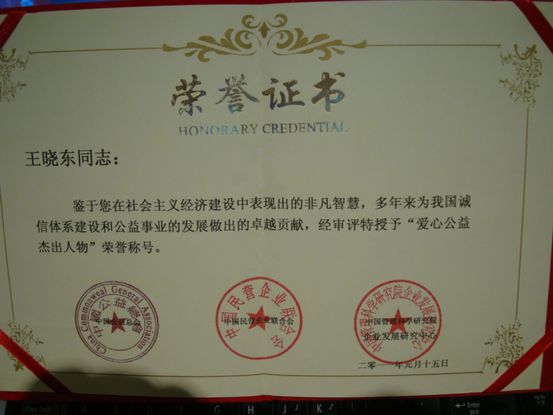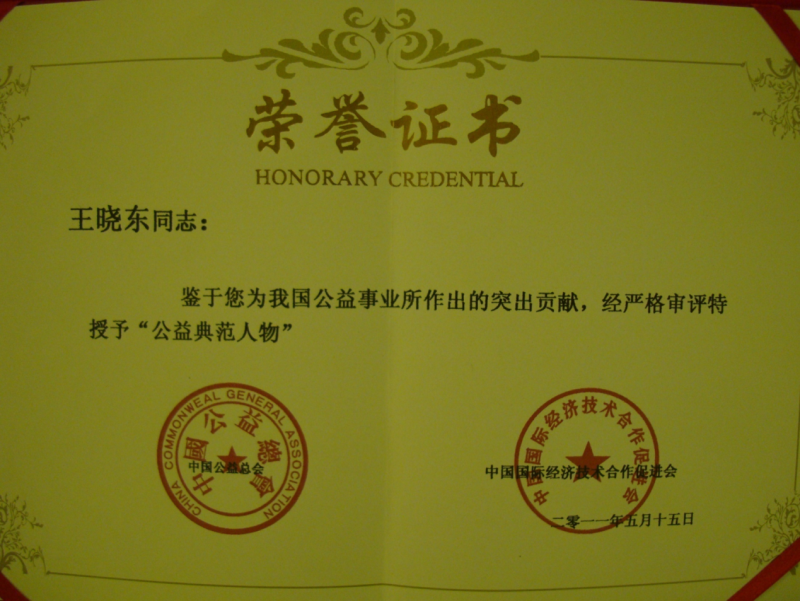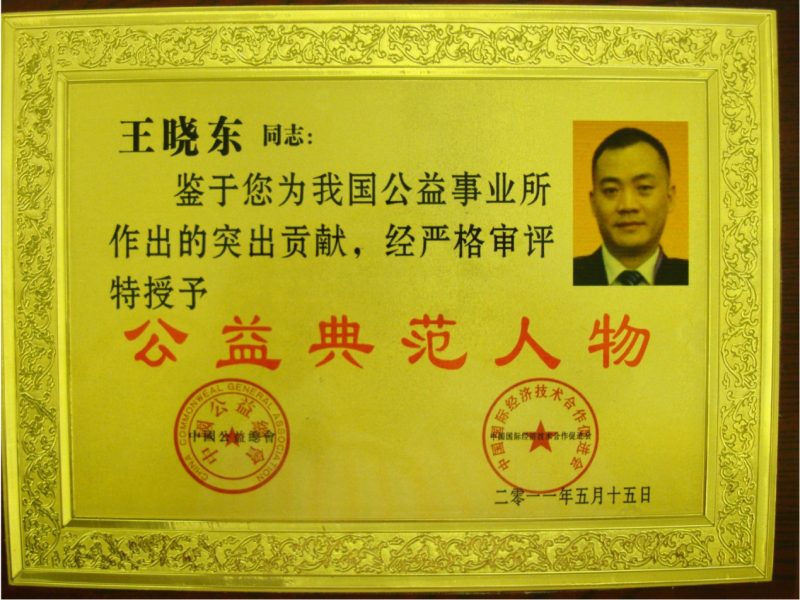 多年来,著名道德养生学者王晓东被中国慈善总会、中国民营企业联合会聘为中国公益与经济发展高峰论坛名誉副主席。被中华爱国工程联合会评为“杰出爱国人士”、被中国公益总会评为“爱心公益杰出人物”、“公益典范人物”等荣誉称号。