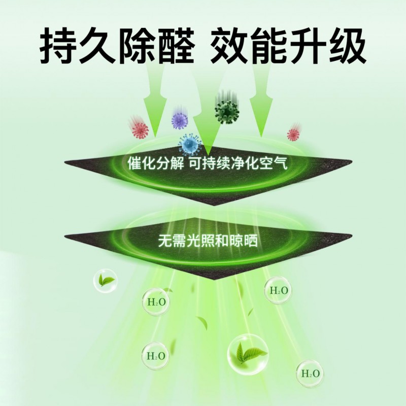 技术优势:无需光照、作用持久、避免二次释放(与传统活性炭吸附有本质区别)这项技术的突破性并非单一要素的结果,而是多个创新点共同作用的产物。“分解”而非“吸附”:这与普通活性炭只能物理“吸附”甲醛有本质区别。活性炭吸附容量有限,一旦饱和或环境温度升高,已吸附的甲醛又会重新释放出来,造成二次污染。而活性锰技术通过催化作用,从分子结构上破坏了甲醛,将其转化为无害的二氧化碳和水,这个过程是不可逆的,从而根除了二次污染的隐患。